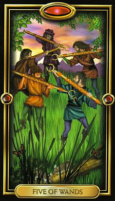 The 5 of Wands represents competition. The 5 is the second assignment number, and therefore a difficult card. 5 combined with the Wand's element fire challenges you. You'll have to fight hard for your idea, but you stand a good chance of succeeding.