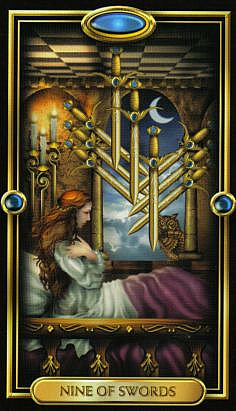 The 9 of Swords represents relief from cropped-up grief. The number 9 is a number of reward and rest and accomplishment. In the element of Swords there is not a lot of time for rest, but without any rest you'd just burn yourself out.