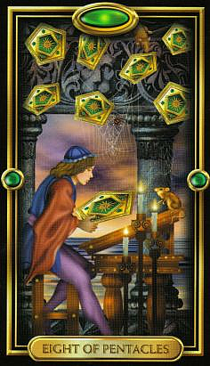 The 8 of Pentacles is about keeping up the hard work you're doing, and trying to be happy about doing that work at the same time. While the 3 of Pentacles is about completing a masterpiece, the 8 of Pentacles is about doing the apprentice work that makes you a master of your trade.