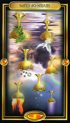 The 7 of Cups is about making a choice between different ideals. But Cups, with the water element, don't like making definitive choices that much, making this 7 in this suit a bit of a hard choice.