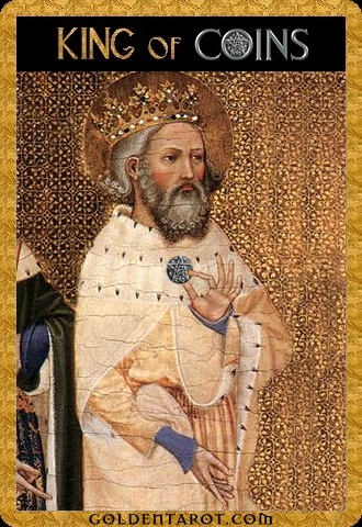 The King of Pentacles uses his Earthly attributes to rule. He goes about his work like an old style business man; he avoids unnecessary risks, aims for real results, and acts from confidence.