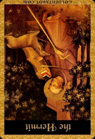 The Hermit shuts out the world and retreats into solitude to better understand some spiritual aspect of life. He opens to the cosmos and lets it's wisdom sink in. Hermits are often seen as wise old men who can guide a traveller along a journey.