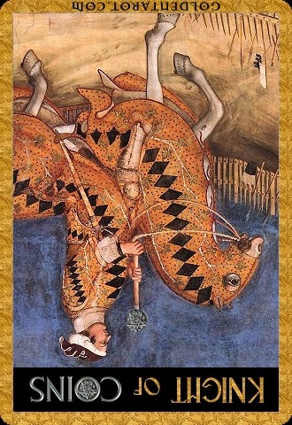The Knight of Pentacles doesn't like to get worked up about anything. He prefers to make quiet steady progress by sticking to a persevering attitude, while not allowing himself to become exhausted or stressed.