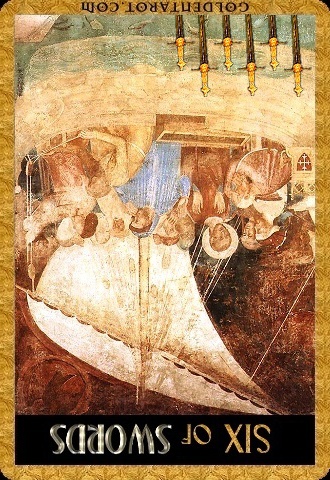 The 6 of Swords is a reward number after the hard assignment in 5 of Swords, it brings you to a safe place to rest a bit.