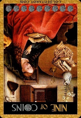 The 9 of Pentacles represents earned rest. The element Earth, attached to the Pentacles suit, appreciates the rest that completion of hard work brings. This is a good time for games and relaxation.