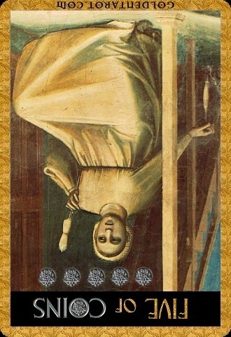 The 5 of Pentacles is an assignment-number card, and is about letting go of your securities. Pentacles element Earth (also) represents material posessions, so this card is about letting go of (some of) your worldly assets.