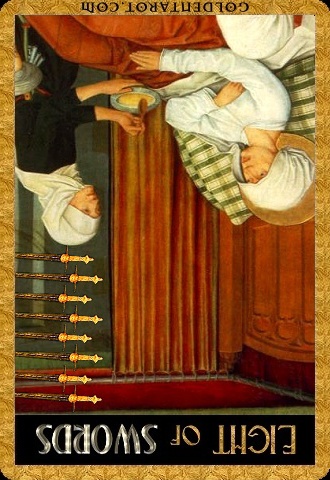 The 8 of Swords is about slowly regaining strength and energy. The 8 is an assignment number, and in the element of Swords it's a bit harder than usual.