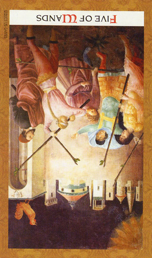 The 5 of Wands represents competition. The 5 is the second assignment number, and therefore a difficult card. 5 combined with the Wand's element fire challenges you. You'll have to fight hard for your idea, but you stand a good chance of succeeding.