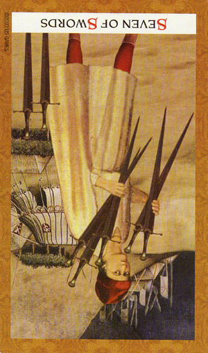 The 7 of Swords is about making slow progress because you can't trust the situation and/or people around you.