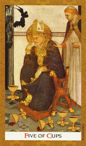 The 5 of Cups is about overcoming sadness and disappointment. You've let go of your old securities to embrace the new and exciting, now something has gone awry and you feel bad about that. But don't forget to notice those things that did go right.