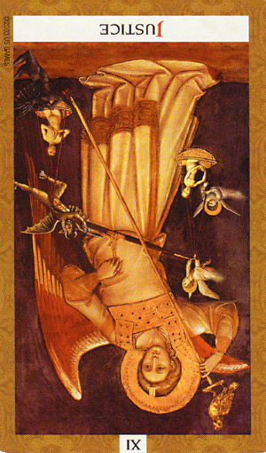 This card carries the number 11. In the Rider-Waite deck, Strength and Justice have swapped places because Waite saw links with the astrological signs Leo and Libra.