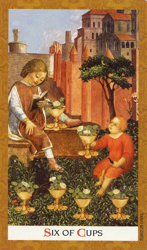 The 6 of Cups is about having confidence in something. It is the number of security and harmony. In the suit of Cups this means to be in harmony with yourself.