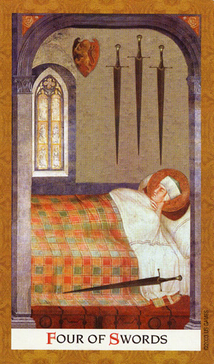 4 is the first number in the cycle of giving things shape. It's about making things real. The element of Swords also relates to making things real, so this enhances the effect so much that arrogance can cause you to exhaust yourself.