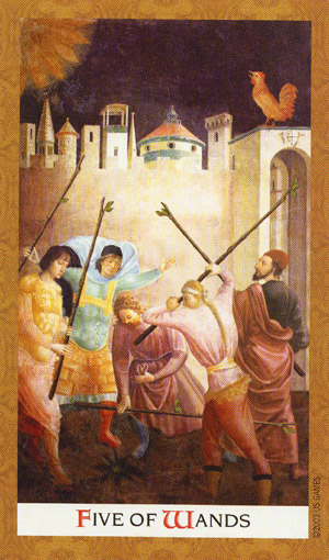 The 5 of Wands represents competition. The 5 is the second assignment number, and therefore a difficult card. 5 combined with the Wand's element fire challenges you. You'll have to fight hard for your idea, but you stand a good chance of succeeding.
