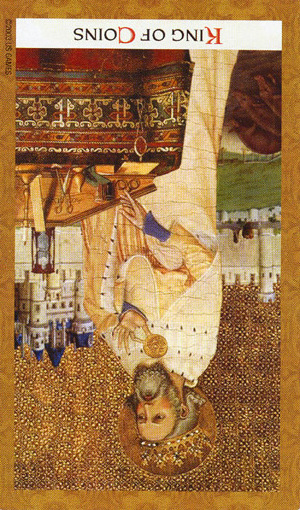 The King of Pentacles uses his Earthly attributes to rule. He goes about his work like an old style business man; he avoids unnecessary risks, aims for real results, and acts from confidence.
