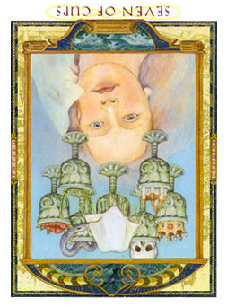 The 7 of Cups is about making a choice between different ideals. But Cups, with the water element, don't like making definitive choices that much, making this 7 in this suit a bit of a hard choice.