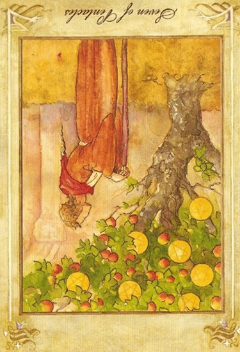 The number 1, associated with this Ace card, is the number of a fresh start with yet more new impulses coming your way. It might be compared to The Fool, the first card of the major arcana.