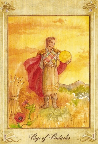 Pages explore and gather information about the road ahead, with an almost naive attitude. The Page of Pentacles is sometimes described as a bridge builder; Pentacles is the suit where the actual work is done, and the Page here enables those that follow to quickly cross difficult terrain.