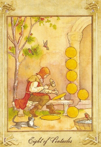 The 8 of Pentacles is about keeping up the hard work you're doing, and trying to be happy about doing that work at the same time. While the 3 of Pentacles is about completing a masterpiece, the 8 of Pentacles is about doing the apprentice work that makes you a master of your trade.
