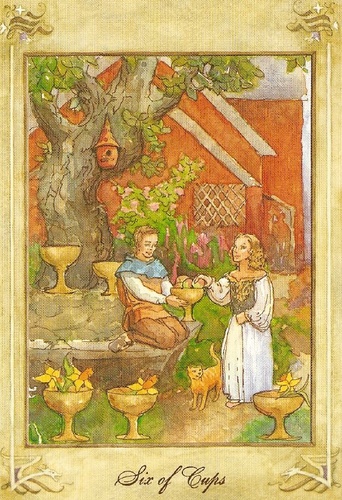 The 6 of Cups is about having confidence in something. It is the number of security and harmony. In the suit of Cups this means to be in harmony with yourself.