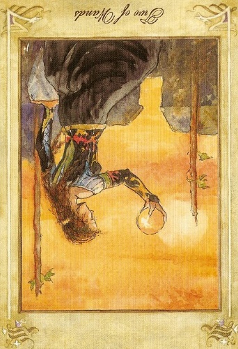 The 2 of Wands represents the research and digestion of a new idea. The number of this card and it's element are somewhat in conflict; while the 2 is focussed inwards, the Wand's element fire is outgoing. Fire wants to steam ahead while the blackbox 2 asks for patience.