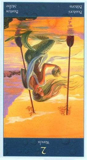 The 2 of Wands represents the research and digestion of a new idea. The number of this card and it's element are somewhat in conflict; while the 2 is focussed inwards, the Wand's element fire is outgoing. Fire wants to steam ahead while the blackbox 2 asks for patience.