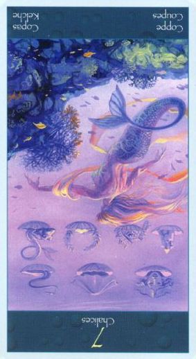The 7 of Cups is about making a choice between different ideals. But Cups, with the water element, don't like making definitive choices that much, making this 7 in this suit a bit of a hard choice.