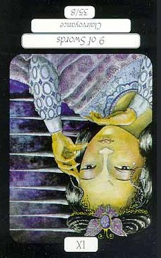 The 9 of Swords represents relief from cropped-up grief. The number 9 is a number of reward and rest and accomplishment. In the element of Swords there is not a lot of time for rest, but without any rest you'd just burn yourself out.