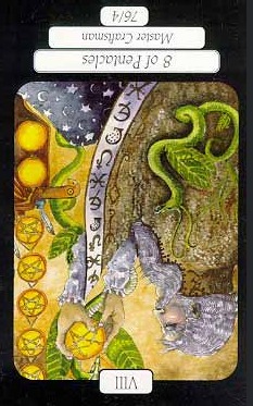 The 8 of Pentacles is about keeping up the hard work you're doing, and trying to be happy about doing that work at the same time. While the 3 of Pentacles is about completing a masterpiece, the 8 of Pentacles is about doing the apprentice work that makes you a master of your trade.