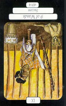 The 9 represents rest after work, which is another thing (like 8) that the element Fire associated with Wands is not very comfortable with. Fire likes to keep going. This rest will probably be spent thinking about what to do next along the course to completion.