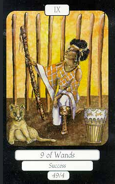 The 9 represents rest after work, which is another thing (like 8) that the element Fire associated with Wands is not very comfortable with. Fire likes to keep going. This rest will probably be spent thinking about what to do next along the course to completion.