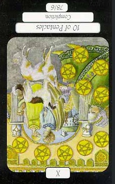 The 10 of Pentacles represents material posessions. The number 10 of Pentacles forms the links to the Ace (first card) of Wands (the first suit in the minor Arcana), and thus prepares to bring you back to the beginning of the minor Arcana, ready for a next cycle through the tarot.