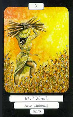 The 10 of Wands is therefore the transition from the element Fire (associated with Wands) to the element Water, associated with Cups. As you might imagine, this not the easiest of transitions.