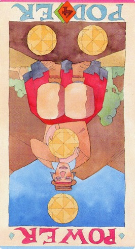 The 4 of Pentacles is about holding on to what you got. The number 4 represents structure and order, and fits well with the suit's element, Earth.