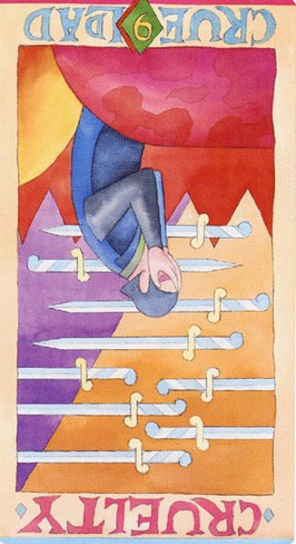 The 9 of Swords represents relief from cropped-up grief. The number 9 is a number of reward and rest and accomplishment. In the element of Swords there is not a lot of time for rest, but without any rest you'd just burn yourself out.