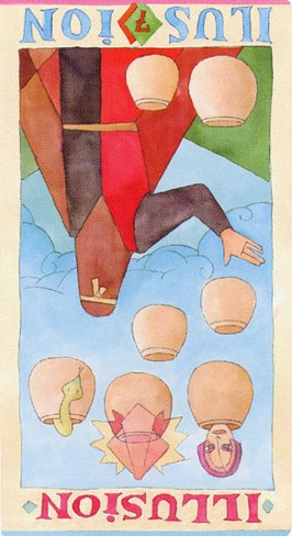 The 7 of Cups is about making a choice between different ideals. But Cups, with the water element, don't like making definitive choices that much, making this 7 in this suit a bit of a hard choice.