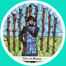 The 9 represents rest after work, which is another thing (like 8) that the element Fire associated with Wands is not very comfortable with. Fire likes to keep going. This rest will probably be spent thinking about what to do next along the course to completion.
