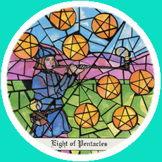 The 8 of Pentacles is about keeping up the hard work you're doing, and trying to be happy about doing that work at the same time. While the 3 of Pentacles is about completing a masterpiece, the 8 of Pentacles is about doing the apprentice work that makes you a master of your trade.