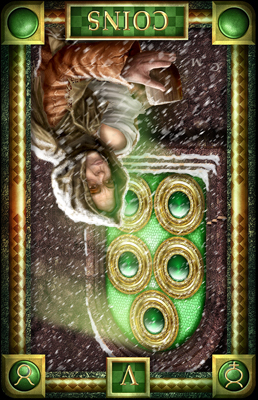 The 5 of Pentacles is an assignment-number card, and is about letting go of your securities. Pentacles element Earth (also) represents material posessions, so this card is about letting go of (some of) your worldly assets.