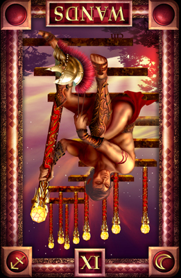 The 9 represents rest after work, which is another thing (like 8) that the element Fire associated with Wands is not very comfortable with. Fire likes to keep going. This rest will probably be spent thinking about what to do next along the course to completion.