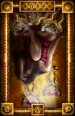 The 5 of Cups is about overcoming sadness and disappointment. You've let go of your old securities to embrace the new and exciting, now something has gone awry and you feel bad about that. But don't forget to notice those things that did go right.