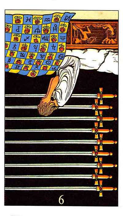 The 9 of Swords represents relief from cropped-up grief. The number 9 is a number of reward and rest and accomplishment. In the element of Swords there is not a lot of time for rest, but without any rest you'd just burn yourself out.