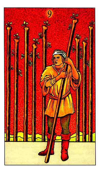The 9 represents rest after work, which is another thing (like 8) that the element Fire associated with Wands is not very comfortable with. Fire likes to keep going. This rest will probably be spent thinking about what to do next along the course to completion.