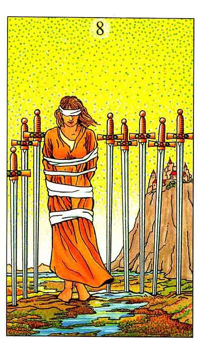The 8 of Swords is about slowly regaining strength and energy. The 8 is an assignment number, and in the element of Swords it's a bit harder than usual.