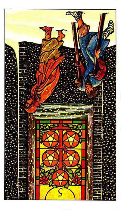 The 5 of Pentacles is an assignment-number card, and is about letting go of your securities. Pentacles element Earth (also) represents material posessions, so this card is about letting go of (some of) your worldly assets.