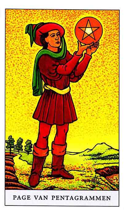 Pages explore and gather information about the road ahead, with an almost naive attitude. The Page of Pentacles is sometimes described as a bridge builder; Pentacles is the suit where the actual work is done, and the Page here enables those that follow to quickly cross difficult terrain.