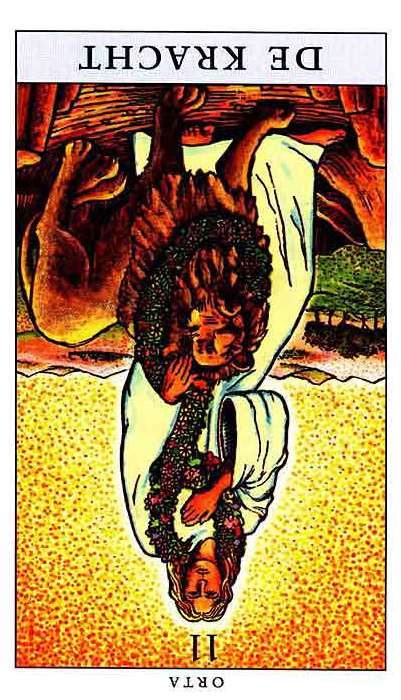 This card carries the number 11. In the Rider-Waite deck, Strength and Justice have swapped places because Waite saw links with the astrological signs Leo and Libra.