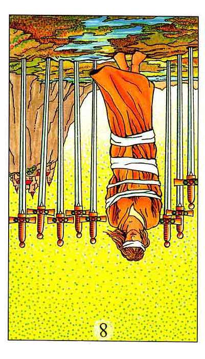 The 8 of Swords is about slowly regaining strength and energy. The 8 is an assignment number, and in the element of Swords it's a bit harder than usual.