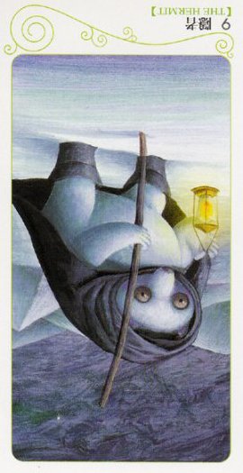 The Hermit shuts out the world and retreats into solitude to better understand some spiritual aspect of life. He opens to the cosmos and lets it's wisdom sink in. Hermits are often seen as wise old men who can guide a traveller along a journey.