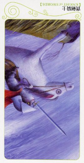 The Knight of Swords lacks the naivety of the Knight of Wands, he has analyzed the terrain ahead and weighed his options there. He knows what his own nature can throw into the mix, but does not let himself be held idle by that. The activities ahead will likely include the solving of conflicts and problems on your road to your ideal.